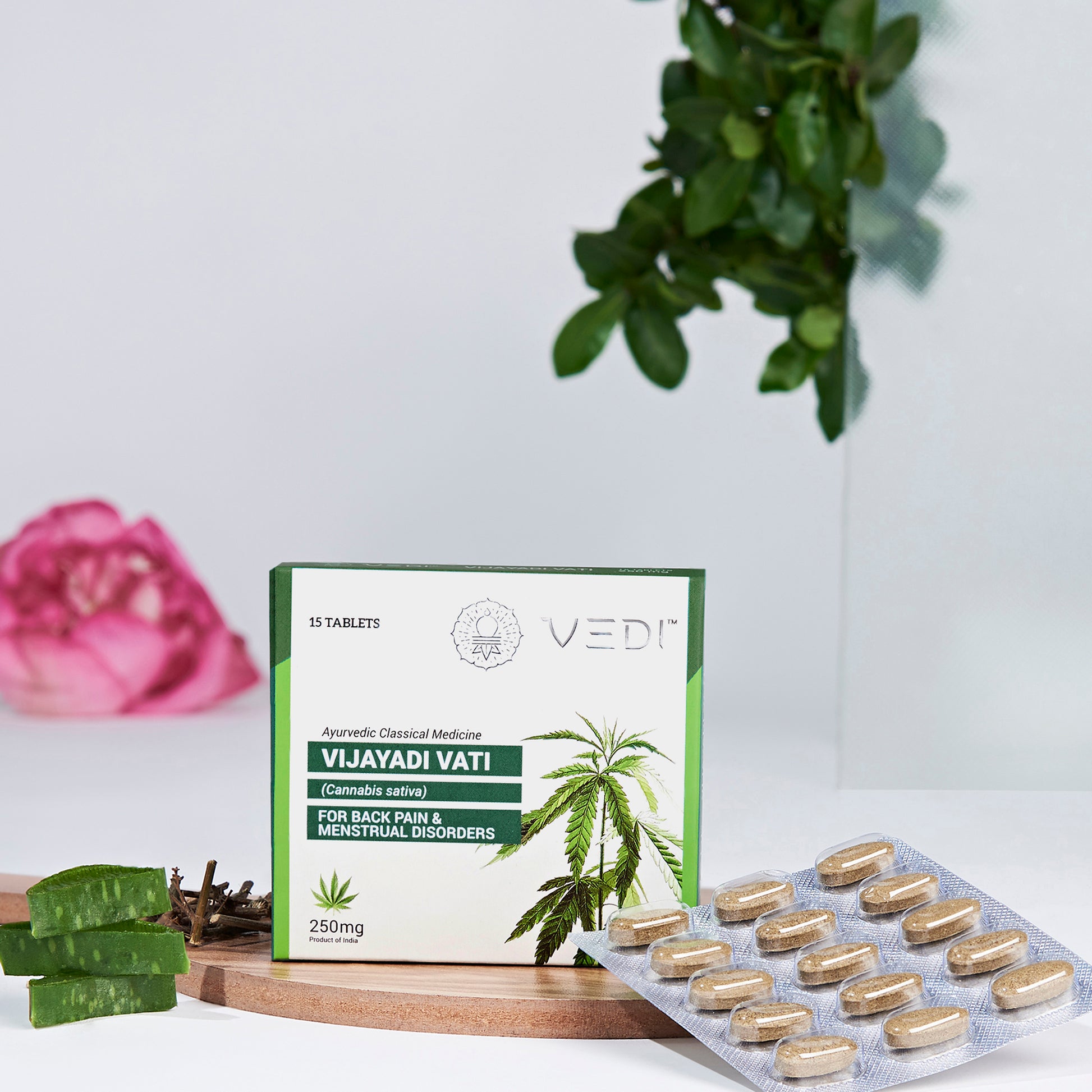 Vijaya (Cannabis) and Apamarg help reduce inflammation (shothahara) and alleviate abdominal pain (shoolanashak), Aloe vera facilitates removal of menstrual blood flow obstruction (rajorodhnaashak). The above properties of the ingredients helps in reducing the concentration of inflammatory mediators such as prostaglandins and thus reduces pain.